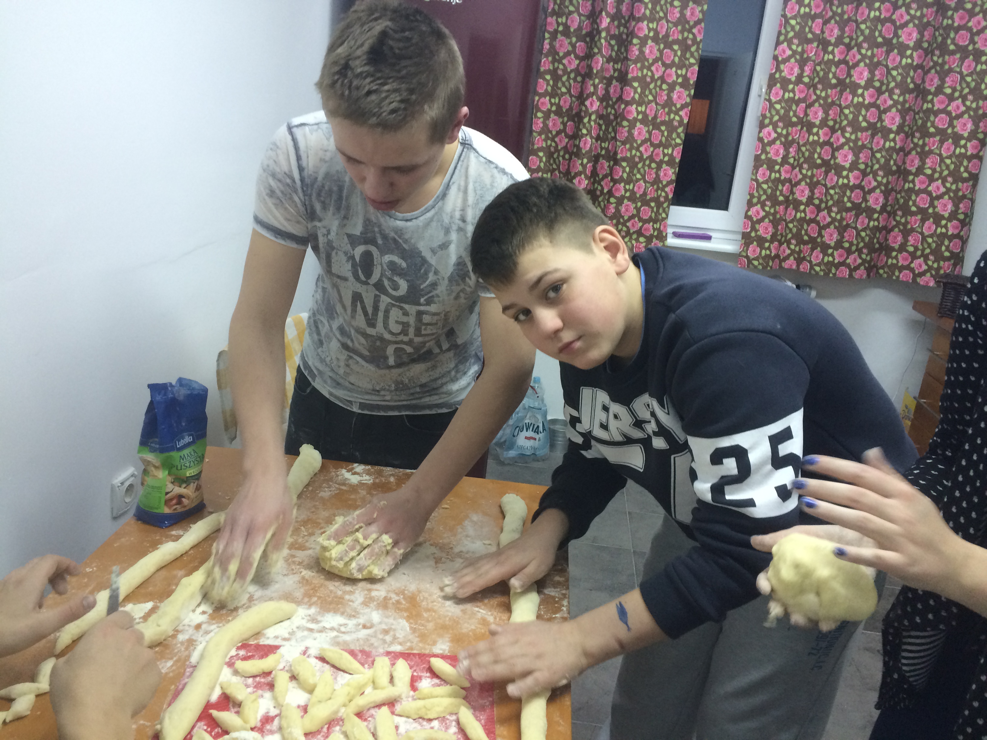 Przy okazji wspólnego gotowania ujawniły się różne talenty: Rafał, Daniel, Piotrek i Sebastian świetnie zagnietli ciasto i uformowali kopytka, Wychowawczynie razem z panią pedagog – ugotowały je. Reszta chłopców, czyli Adrian, Krzyś, Olek, Paweł i Maciek – nakryli do stołu i potem zmyli naczynia. Rafał dbał, żeby każdy się najadł i podawał kolejne, ugotowane porcje. Pan Kuba wspierał nas duchowo i organizacyjnie.